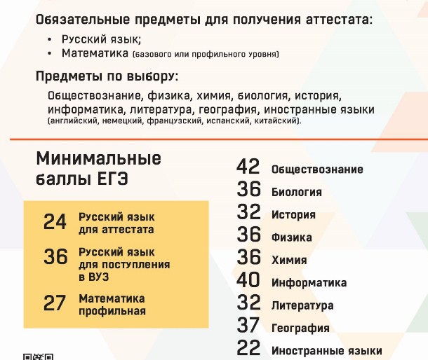 Так, чтобы получить документ об окончании школы, выпускникам необходимо сдать два обязательных предмета: русский язык и математику (базового или профильного уровня). Минимальные баллы по русскому языку — 24 (для аттестата) и 36 (для поступления в вуз), а по профильной математике — 27.