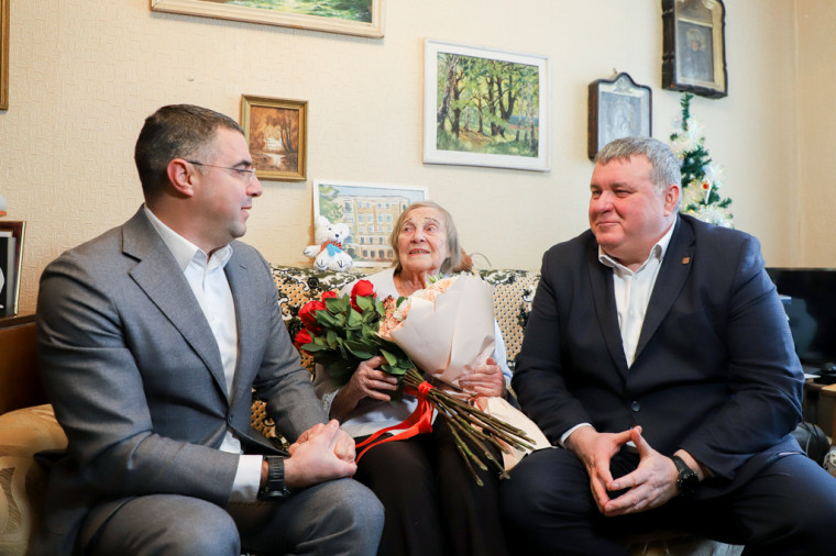 Глава города Алексей Эрк и глава администрации Илья Беспалов пообщались с ветераном Великой Отечественной войны, блокадницей Людмилой Павловной Николаевой.