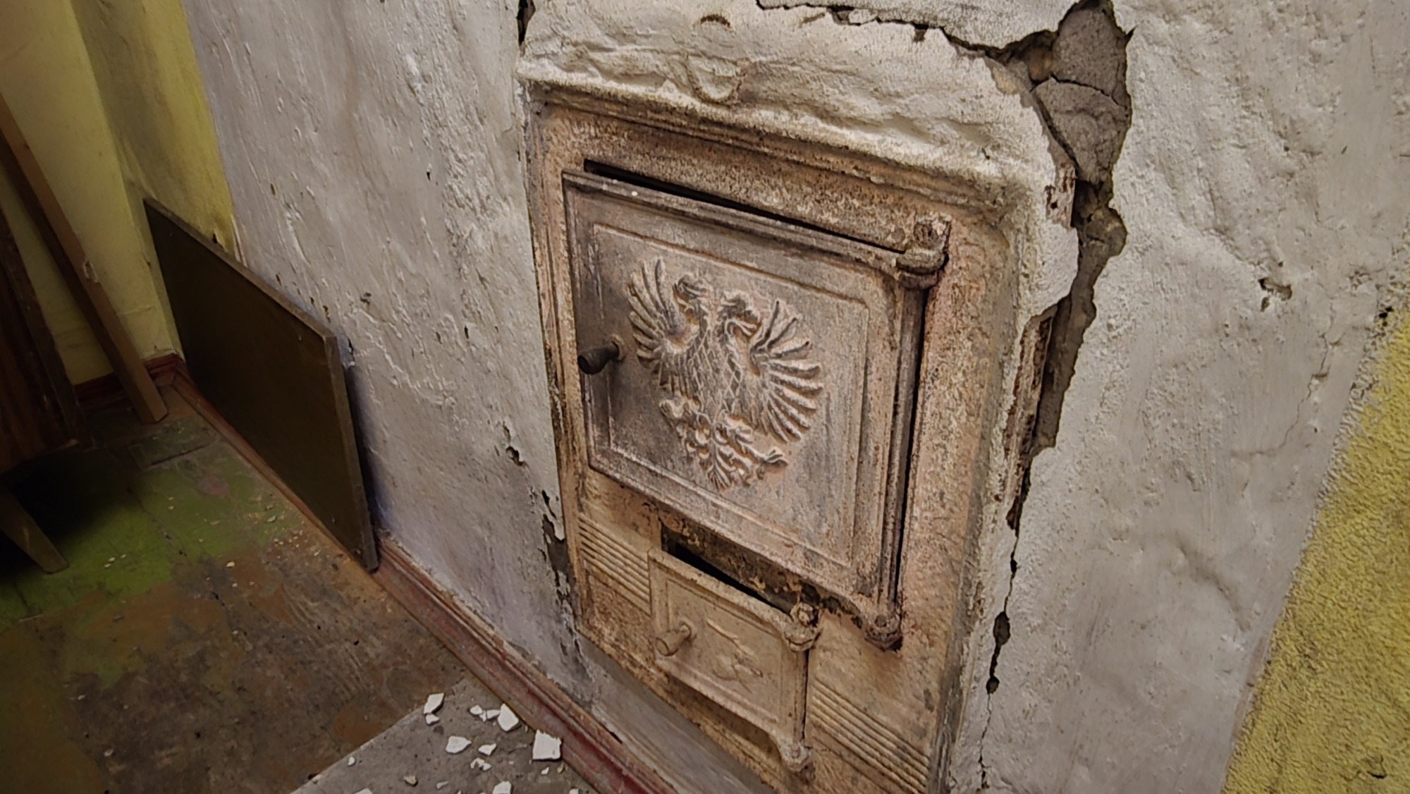 Старинная печь местами потрескалась. О первом хозяине напоминает лишь чугунная заслонка с двуглавым орлом на фронтоне. По словам женщины, именно печки держат весь дом на плаву. Рухнут они – рухнет и весь дом. Печи – не единственное, что в этом доме «дышит на ладан».