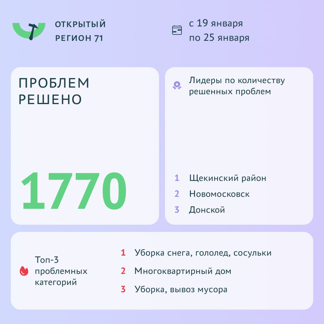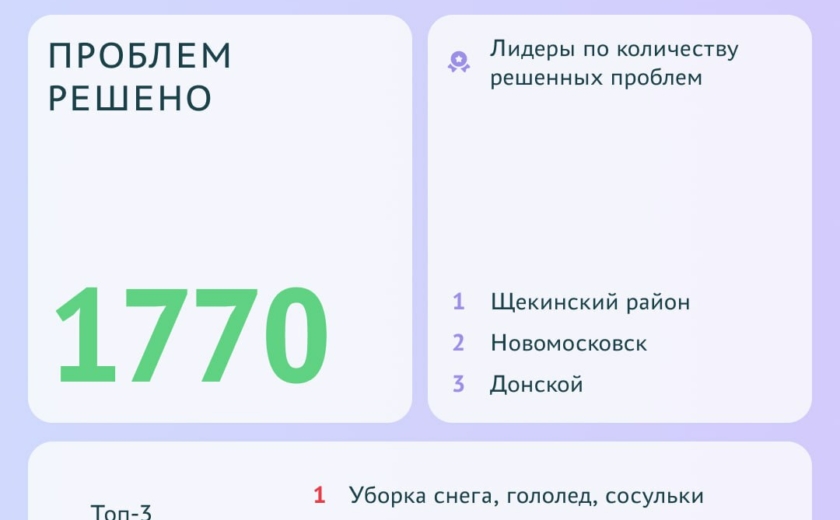 Чаще всего туляки жаловались на уборку снега, сосульки и гололед. В муниципалитеты — лидеры по количеству решенных проблем вошли Щекинский район, Новомосковск и Донской.