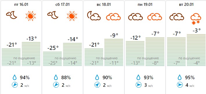 В Тульской области выходные будут отличаться облачностью и отсутствием осадков. В субботу, 17 января, ночью температура воздуха понизится сразу до -25 градусов. В воскресенье будет немного теплее: -21 ночью и — 9 градусов днем соответственно.