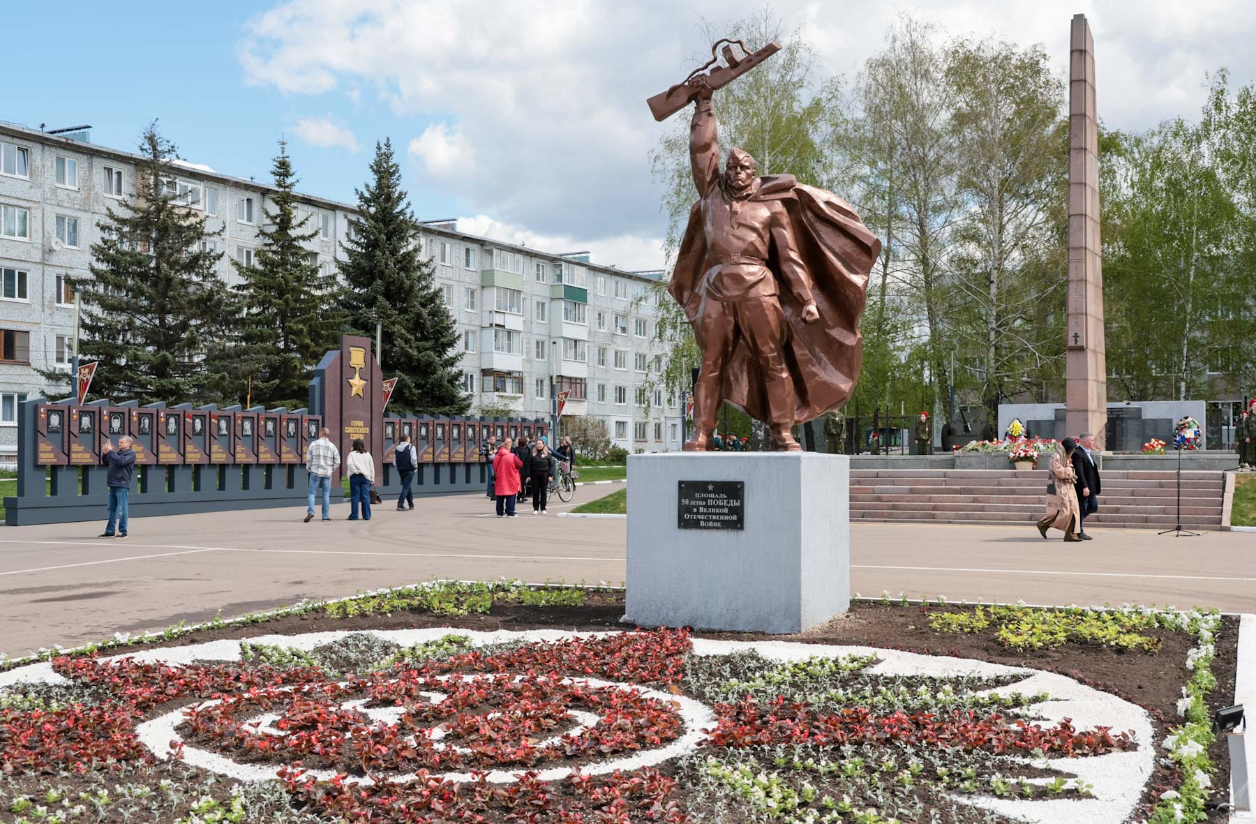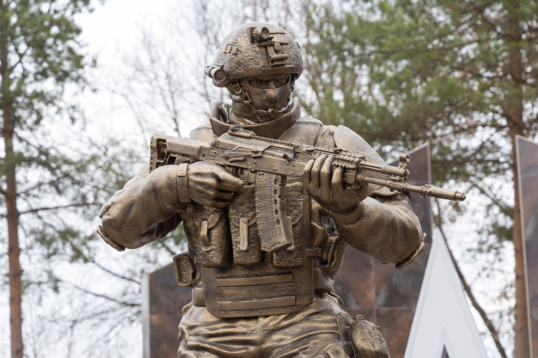 Он объединяет в себе скульптуру «Русский воин», звезду-триколор и четыре стелы, которые напоминают погоны бойцов.