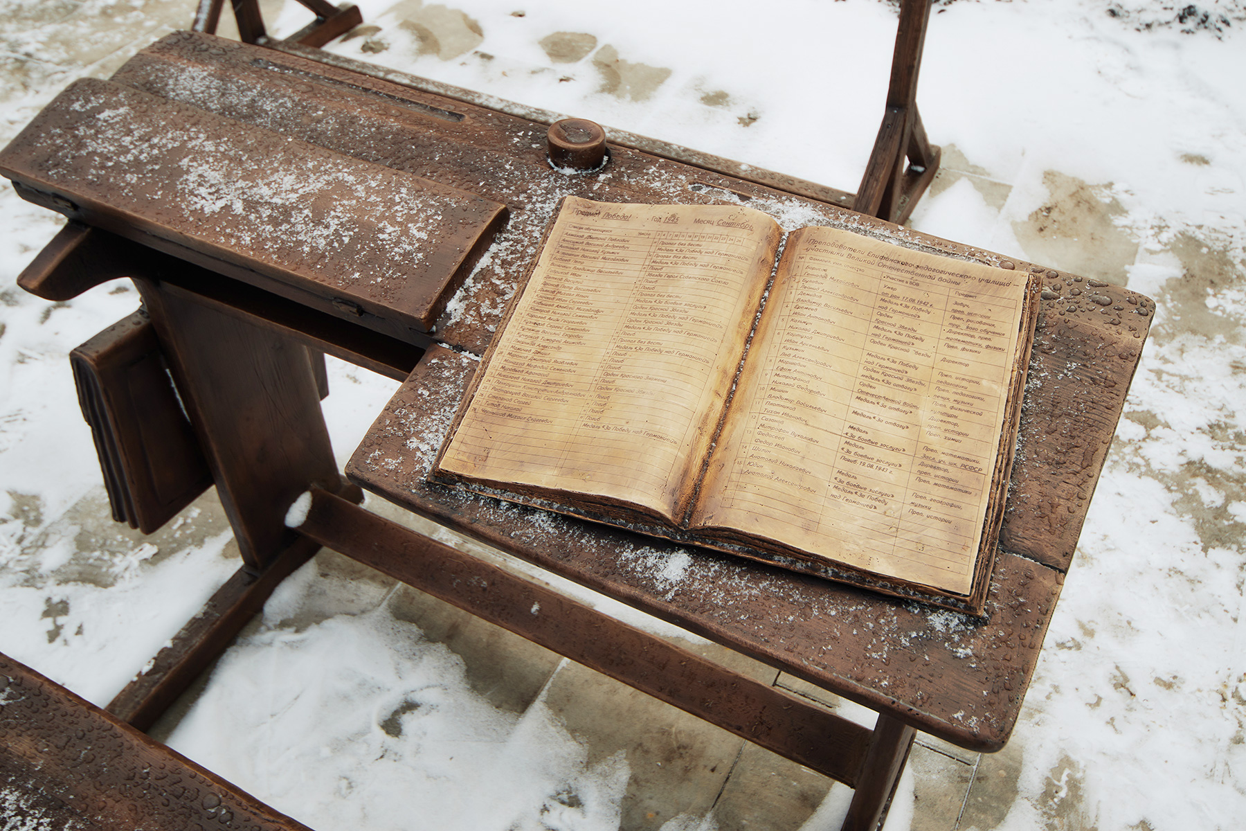 Объект представляет собой школьную парку и доску с классным журналом, в котором указаны имена и фамилии 28 красноармейцев. Это выпускники и педагоги Епифанского педагогического училища, которые добровольно ушли на фронт.