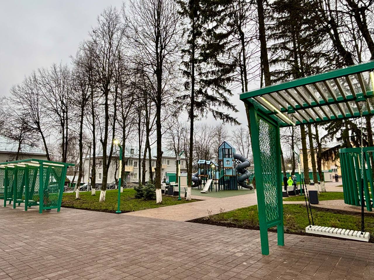 Установлены стационарная сцена, беседки, качели, стенды с историей города и архивными фото, детская площадка, освещение и система наблюдения.