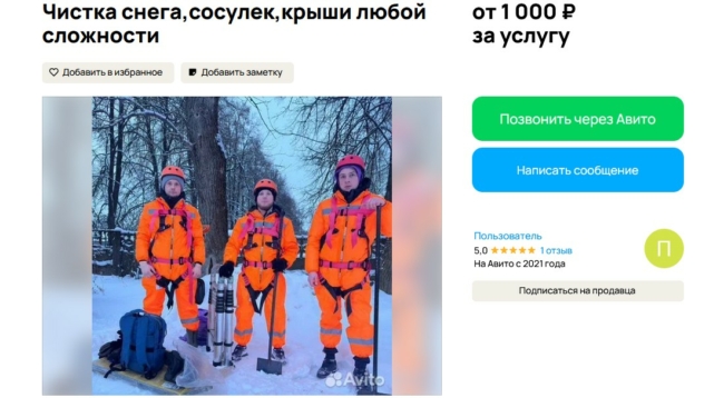 Предлагается уборка снега, крыш, козырьков, парковочных мест и улиц. Работают бригадами от одного до шести человек, возможен экстренный выезд. Цена начинается от 50 рублей за квадратный метр. График — с раннего утра до вечера, примерно с 05:00 до 20:00.