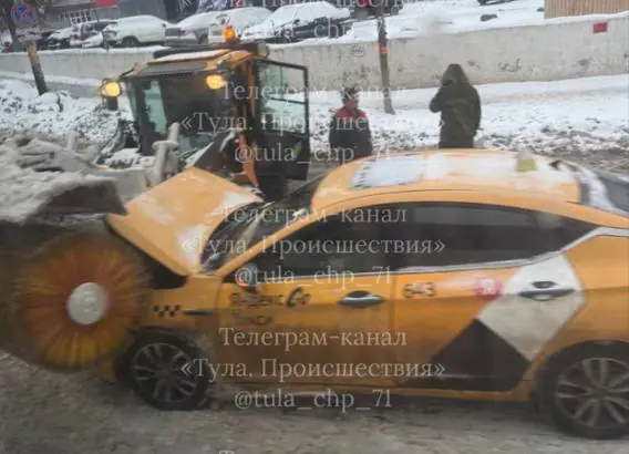 В Туле на улице Путейской у торгового центра «Сарафан» произошло дорожно-транспортное происшествие. Автомобиль такси влетел в снегоуборочную машину.