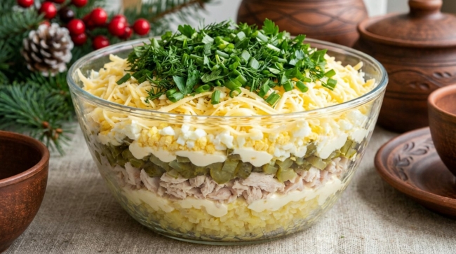 Рецепт прост до невозможности: отварную курицу, яйца, корнишоны, картофель и сыр натирают на терке. Затем выкладывают слоями в прозрачный салатник или на блюдо, промазывая майонезом. Порядок снизу вверх: картофель, куриное филе, корнишоны, яйца, сыр. Сверху — щедрая горка любимой рубленой зелени. Такой салат невозможно испортить, а выглядит он празднично и нарядно.