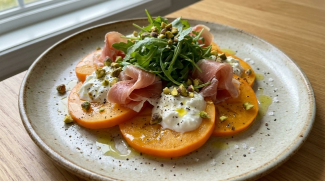 Хурму обычно подают на сладкое как самостоятельный фрукт, но Ляндаев предлагает сделать из нее яркую закуску. Для этого мякоть хурмы выкладывают на тарелку, добавляют сливочный сыр (типа страчателлы или филадельфии), тонкие ломтики прошутто и горсть руколы.