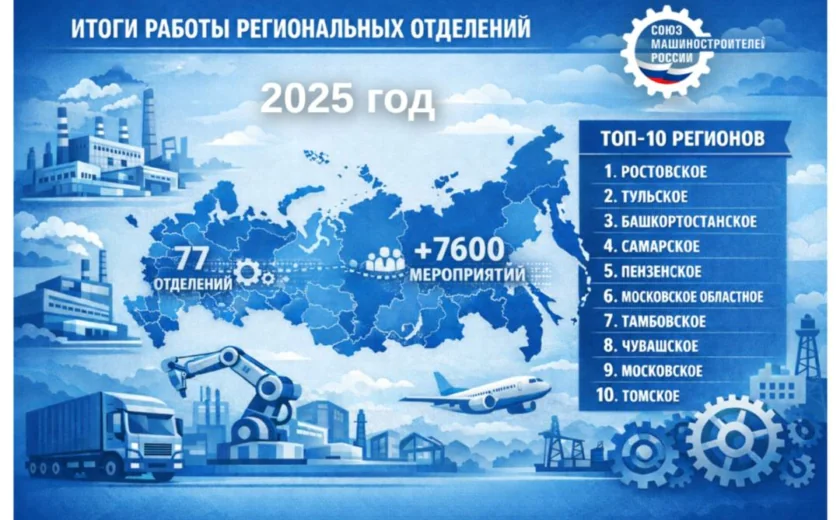 В Союзе машиностроителей России подвели итоги работы региональных отделений. Всего их 77. В прошлом году они провели свыше 7 600 мероприятий, которые охватывали широкий круг задач: от участия в формировании мер поддержки промпредприятий до реализации социальных и гуманитарных инициатив.