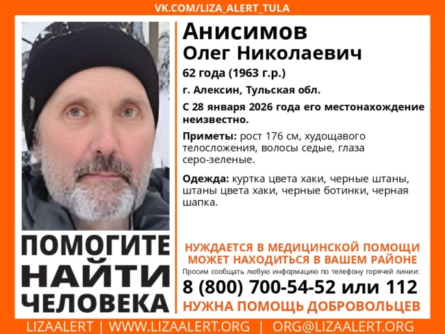 Поисковый отряд «ЛизаАлерт» разыскивает 62-летнего Олега Николаевича Анисимова из города Алексин. Мужчина пропал несколько дней назад — 28 января, и до сих пор его местонахождение неизвестно. Кроме того, мужчина нуждается в медицинской помощи.