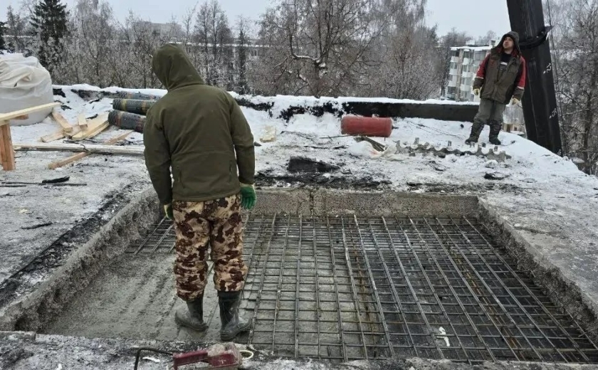 Рабочие уже демонтировали поврежденные части перекрытия кровли, провели обвязку арматуры и залили бетон. Следующий этап — ремонт внутри квартиры.