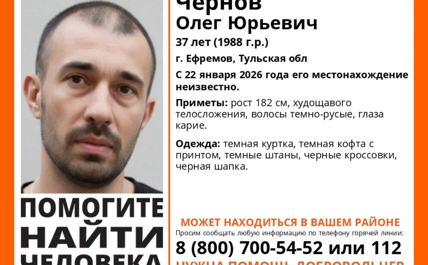 В регионе уже пятые сутки продолжаются поиски пропавшего 37-летнего жителя Ефремова Олега Чернова. Мужчина исчез 22 января, с тех пор о его местонахождении ничего не известно.