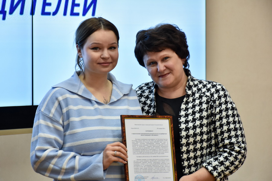 30 января в Туле состоялось вручение жилищных сертификатов детям-сиротам. Министр труда и социальной защиты Тульской области Татьяна Абросимова лично передала документы 55 молодым жителям региона, которые достигли 23 лет и получили право на приобретение собственного жилья.