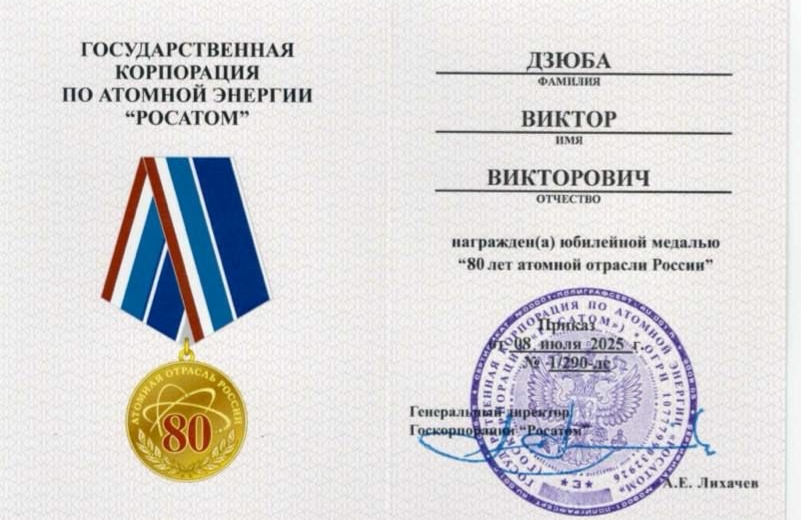 Гендиректор «Росатома» Алексей Лихачев за многолетний добросовестный труд, высокий профессионализм и в связи с 80-летием атомной промышленности наградил депутата Госдумы ФС РФ, члена Комитета Госдумы по энергетике Виктора Дзюбу юбилейной медалью «80 лет атомной отрасли России»