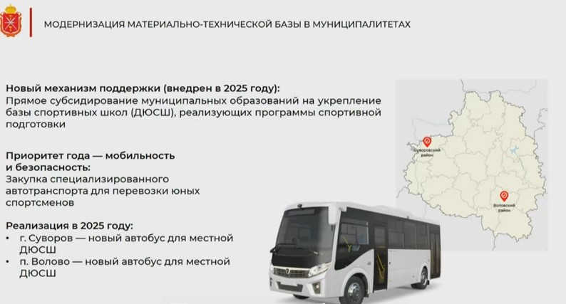 Воловский и Суворовский районы станут пилотными муниципалитетами программы подвоза детей из сел на тренировки. Об этом сообщил губернатор Дмитрий Миляев на заседании совета по спорту.