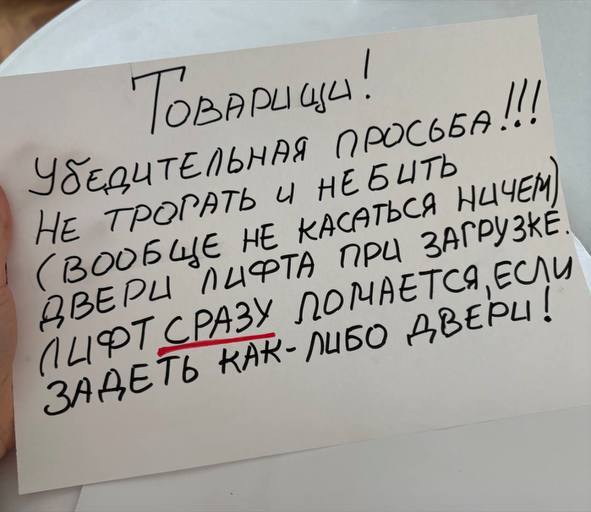 Лифт в подъезде №8 очень капризен — ломается буквально от прикасаний. Уставшие от регулярных «зарядок» из-за поломок жители повесили памятку по его эксплуатации: «Лифт сразу ломается, если задеть как-либо двери!».