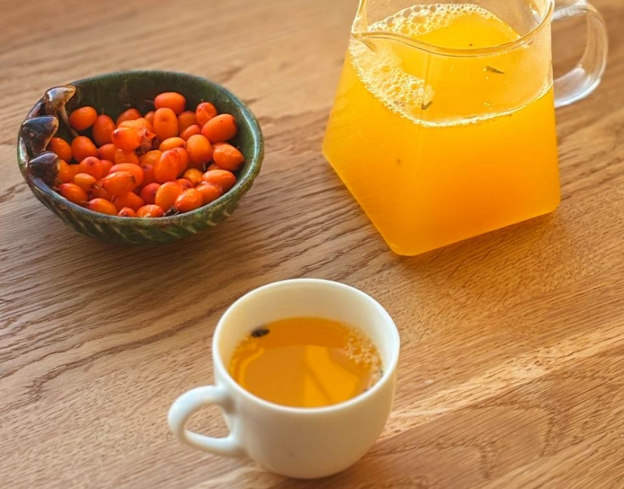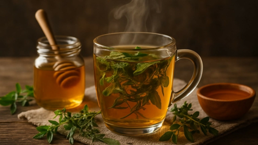 - Ингредиенты пробить блендером и залить кипятком. При заваривании добавить мед.