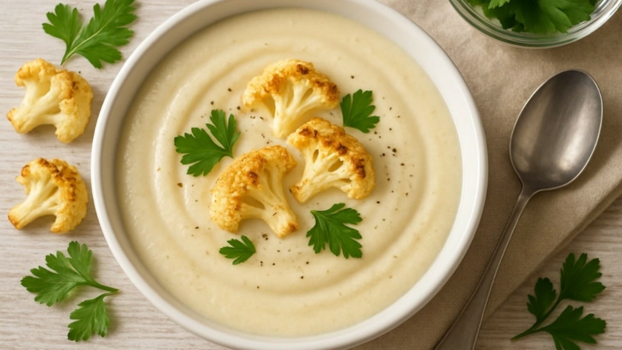 - Добавьте овощной бульон, доведите до кипения и варите 15–20 минут, пока овощи не станут полностью мягкими. Снимите с огня и измельчите суп блендером до гладкой кремовой консистенции. При необходимости отрегулируйте густоту бульоном или водой.