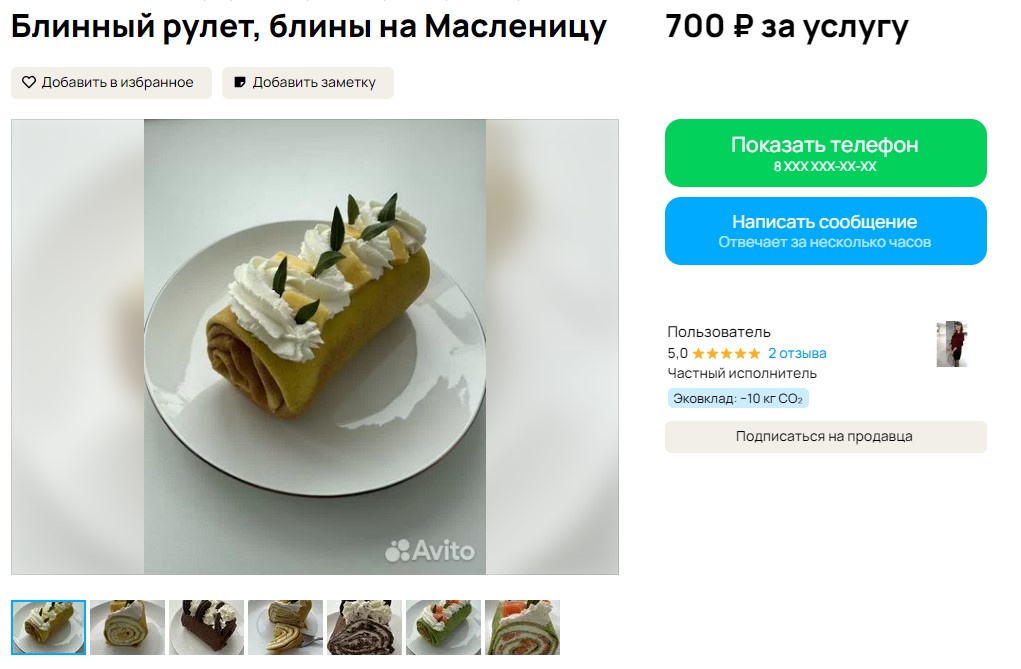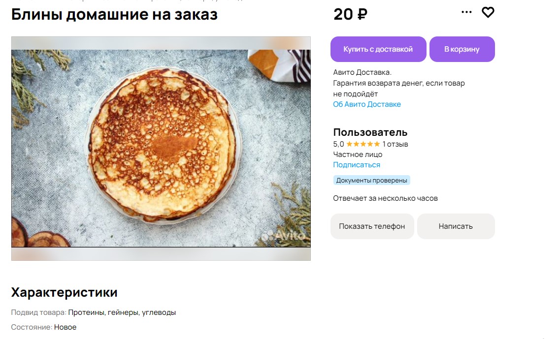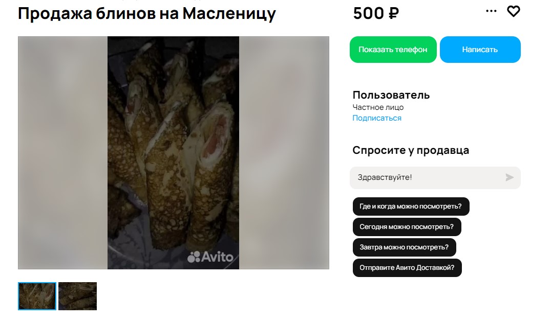 Автор следующего объявления из Тулы готов сделать блины на Масленицу с любой начинкой по заказу. Но и заплатить за это придется соответствующе. Указана цена в 500 рублей.