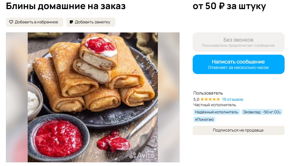 Довольно неожиданное разнообразие начинок предлагает автор объявления из Тулы. Стоимость тонких блинов начинается от 30 рублей за штуку (заказ от 35 штук). В качестве начинок: мясо, творог, печень, картофель с луком и даже квашеная капуста.