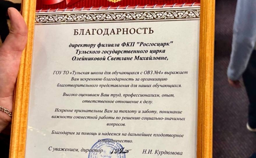 Школа выразила особую благодарность директору Тульского государственного цирка Светлане Олейниковой и руководителю детской цирковой студии Валентине Альховик.