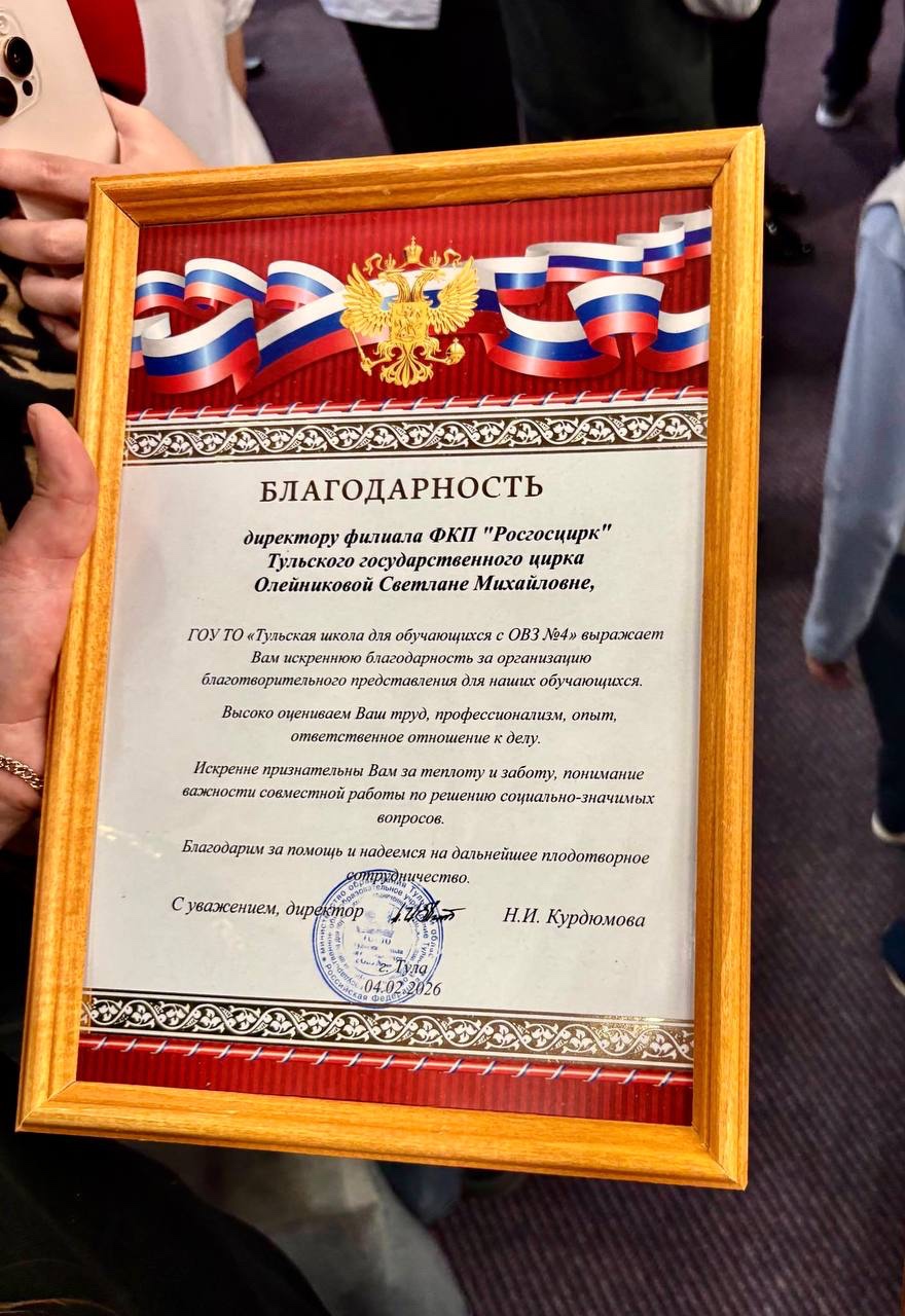 Школа выразила особую благодарность директору Тульского государственного цирка Светлане Олейниковой и руководителю детской цирковой студии Валентине Альховик.