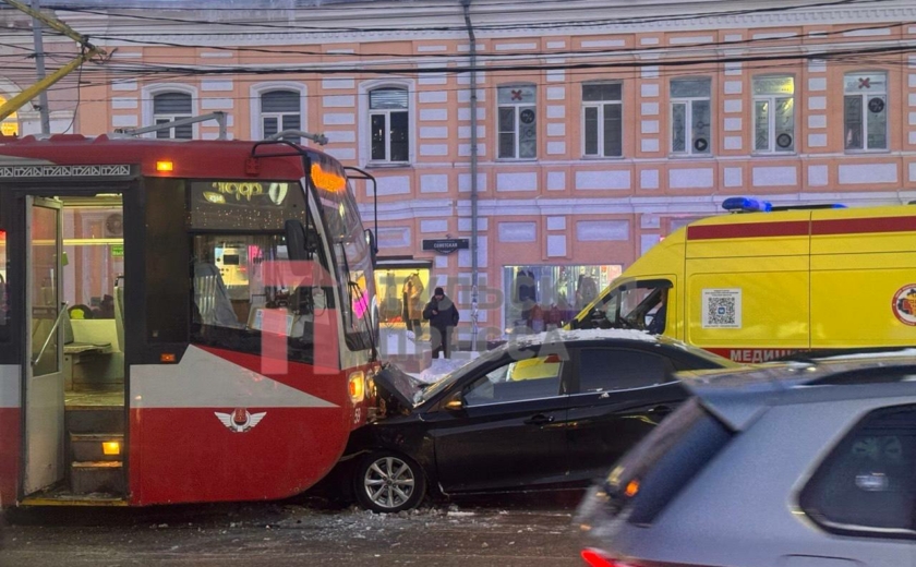 В центре Тулы — серьезная авария аккурат под вечерние пробки. На пересечении улицы Советской и Красноармейского проспекта лоб в лоб столкнулись трамвай и легковой автомобиль Changan.