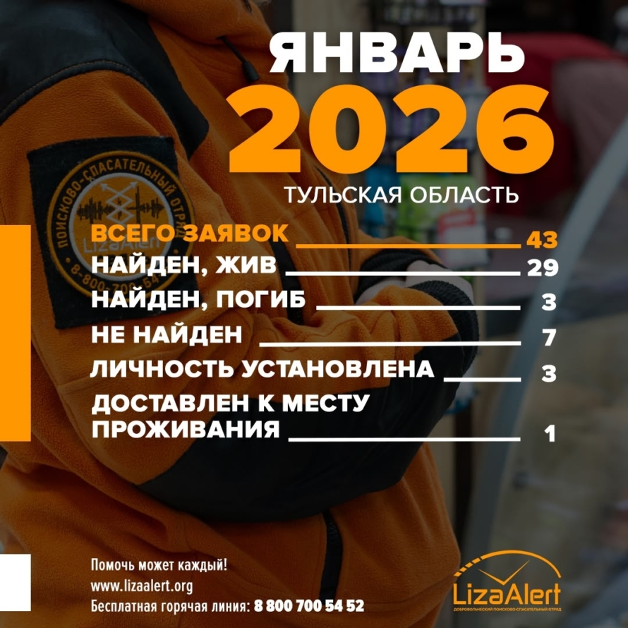 Поисковый отряд «ЛизаАлерт» Тульской области подвел итоги января 2026 года. В этом месяце они получили 43 заявки. Благодаря их усилиям 29 человек были найдены живыми. К сожалению, трое погибли.