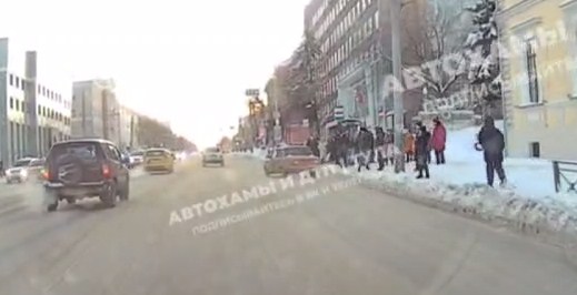 Все произошло на пересечении улицы Гоголевской. Как только загорается зеленый сигнал светофора, водитель разгоняется и начинает «дрифтить», смещаясь в правую полосу ближе к остановке. Показывая экстремальное вождение, он едва не влетает в толпу, которая сразу отступила от края дороги.