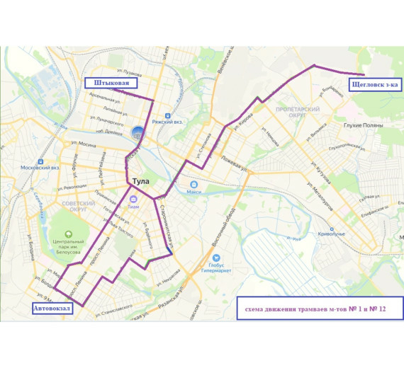 - № 12 — от ул. Штыковой до Автовокзала по обычной схеме, далее через улицу Ф. Энгельса, Советскую, Пролетарскую, Епифанскую, Марата, Кутузова до Щегловской Засеки;