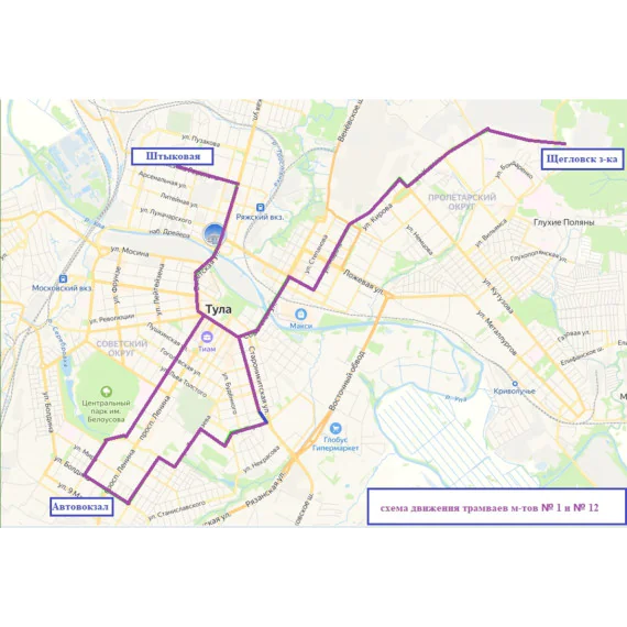 - № 12 — от ул. Штыковой до Автовокзала по обычной схеме, далее через улицу Ф. Энгельса, Советскую, Пролетарскую, Епифанскую, Марата, Кутузова до Щегловской Засеки;