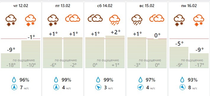Пик потепления прогнозируется на субботу, а в воскресенье утром можно будет наблюдать уходящую оттепель. В понедельник, 16 февраля, от нее не останется и следа: начнет подмораживать, температура резко опустится до -6 градусов.