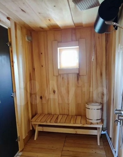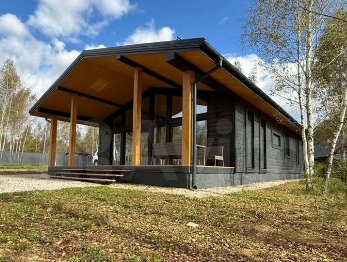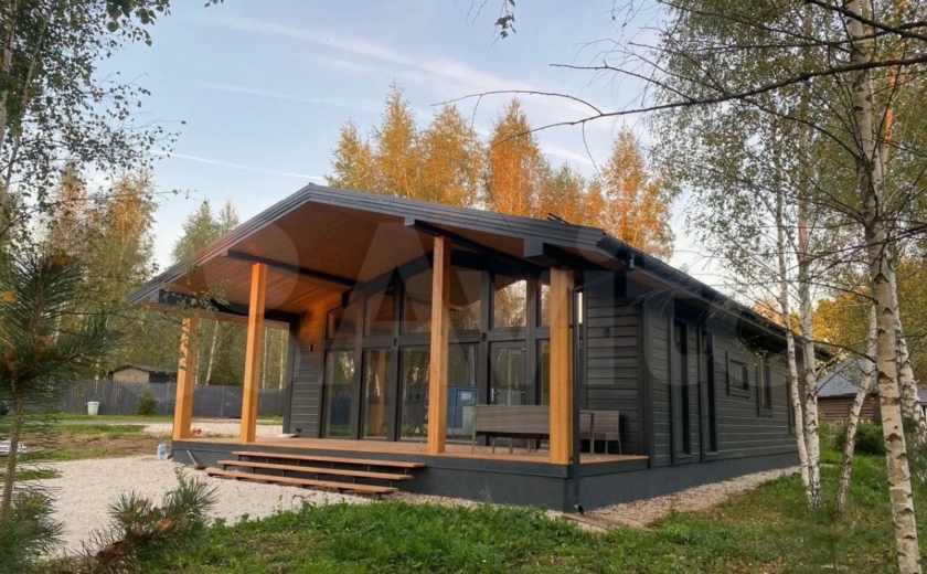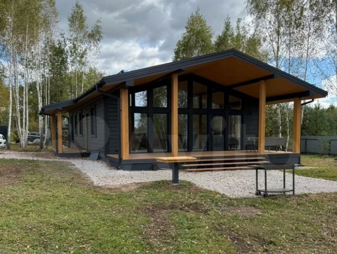 Дом полностью меблирован. Внутри — кухня-гостиная с панорамными окнами, три спальни, ванная комната и прихожая. Отдельно стоит баня, в которой также есть места для отдыха и приема пищи.
