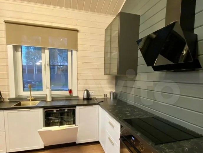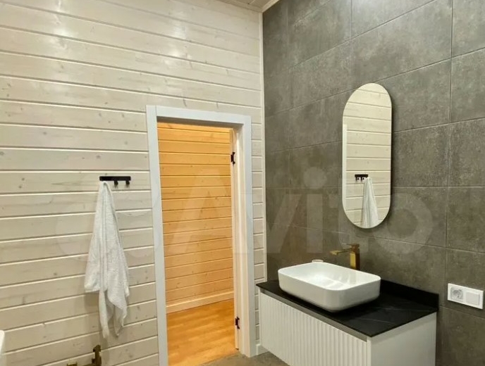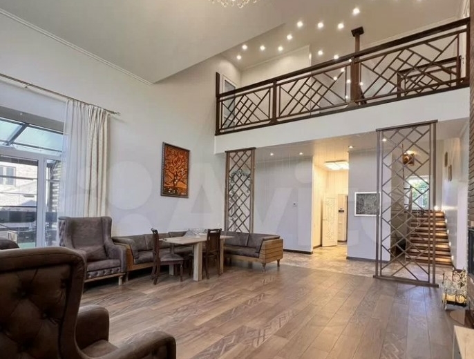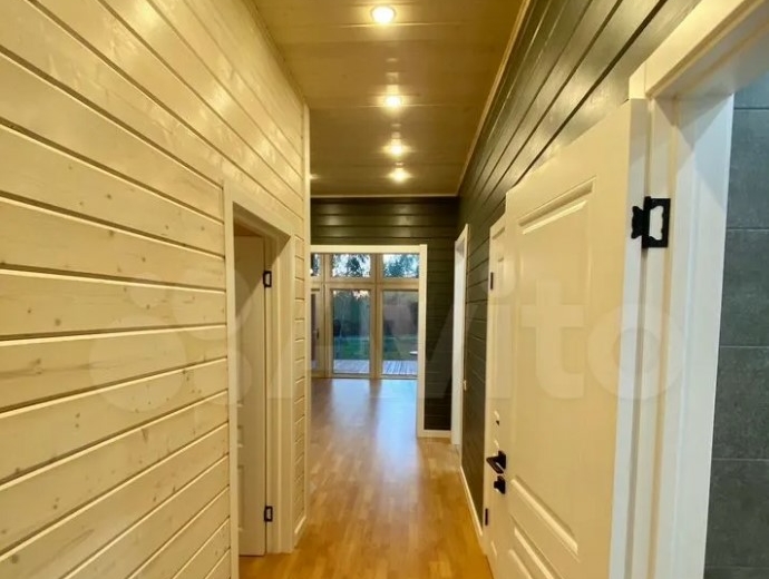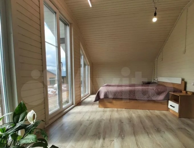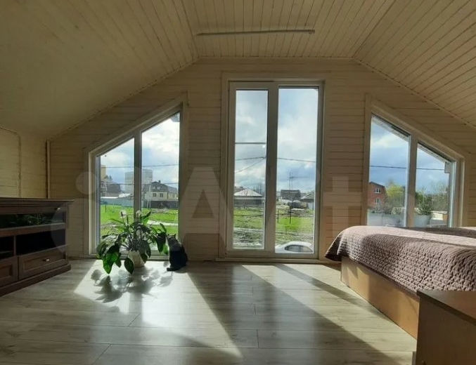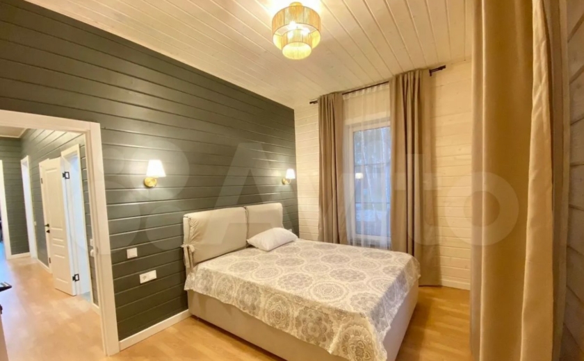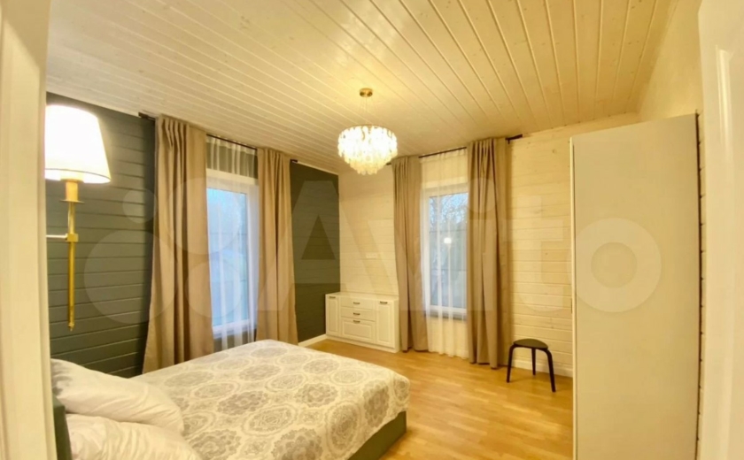 Дом расположен в Заокском районе и продается за 35 млн рублей. На первом этаже находятся кухня-гостиная с выходом на смотровую веранду, рабочий кабинет, санузле, спальня с панорамными окнами. Выше — еще четыре спальни.