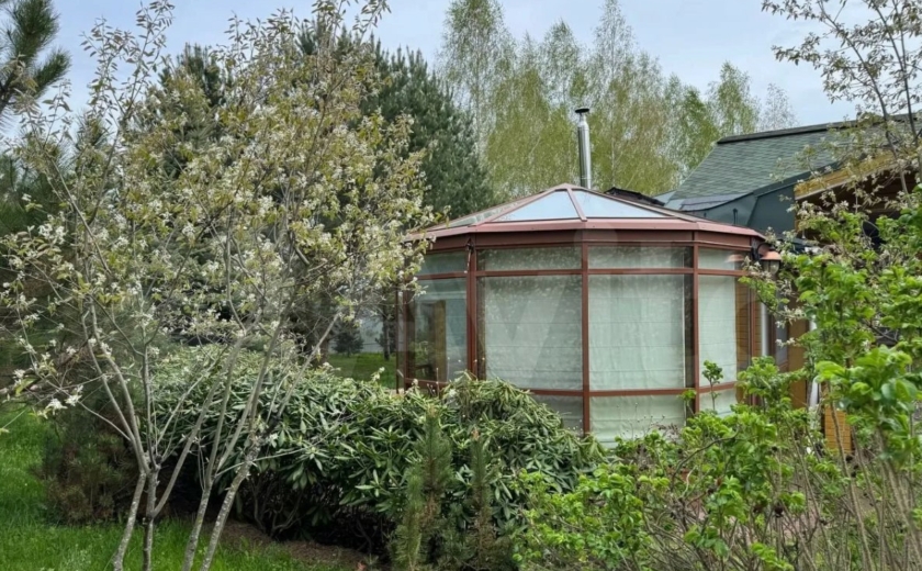 Есть также баня, джакузи и беседка на участке. Панорамные окна выходят на сад из плодовых деревьев. Кроме этого, установлен парник и оборудованы теплые грядки.