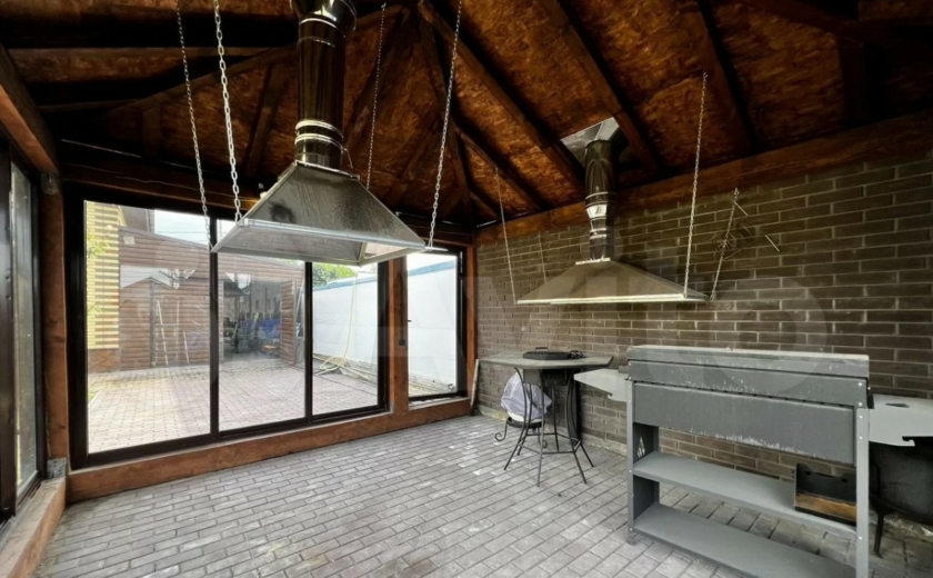 Система отопления в доме с климат-контролем, на первом этаже есть теплый пол, коммуникации проведены. На участке установлены беседка с мангальной зоной (окна тоже панорамные) и гараж.