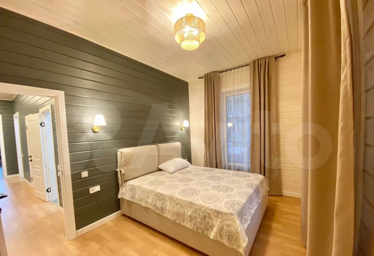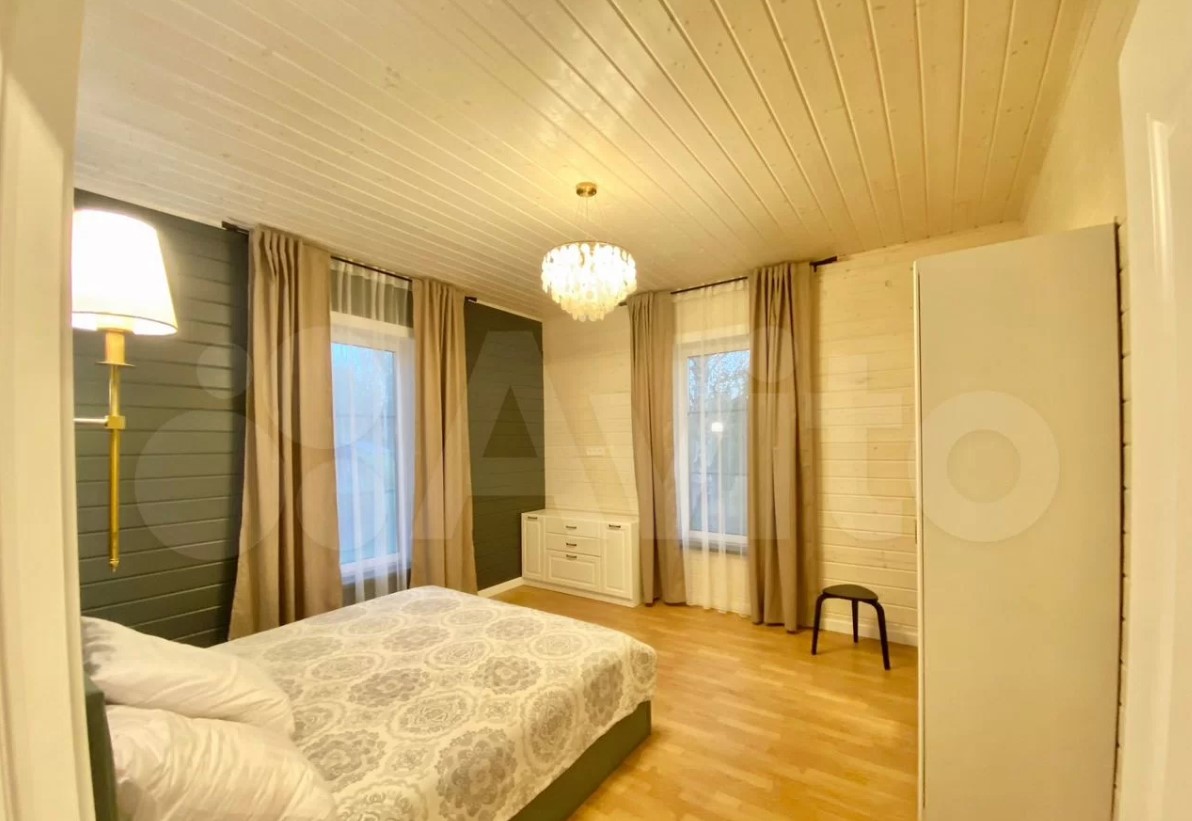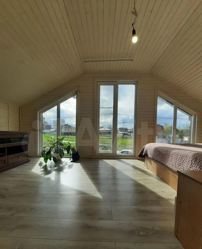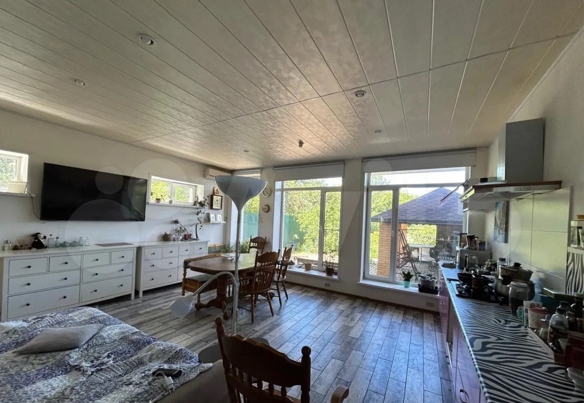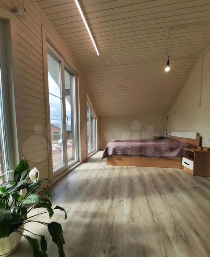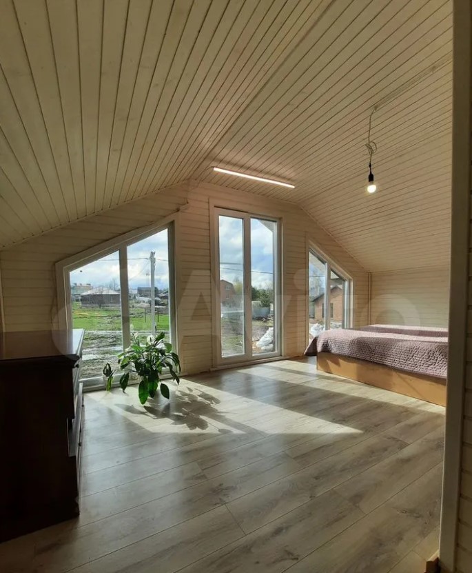 Дом расположен в Заокском районе и продается за 35 млн рублей. На первом этаже находятся кухня-гостиная с выходом на смотровую веранду, рабочий кабинет, санузле, спальня с панорамными окнами. Выше — еще четыре спальни.