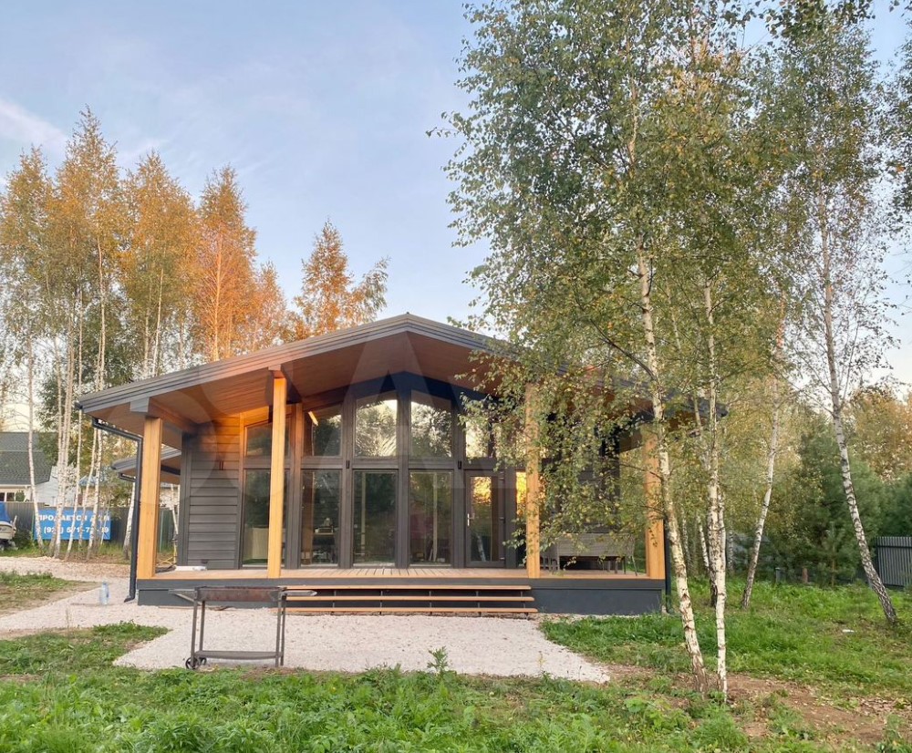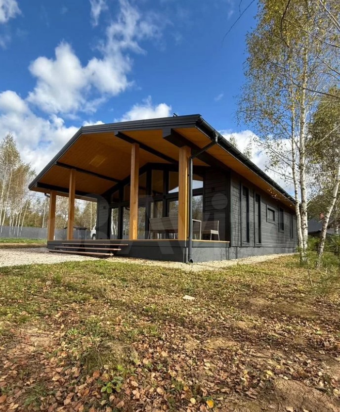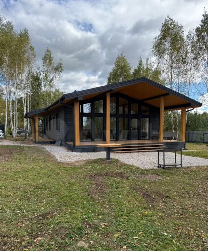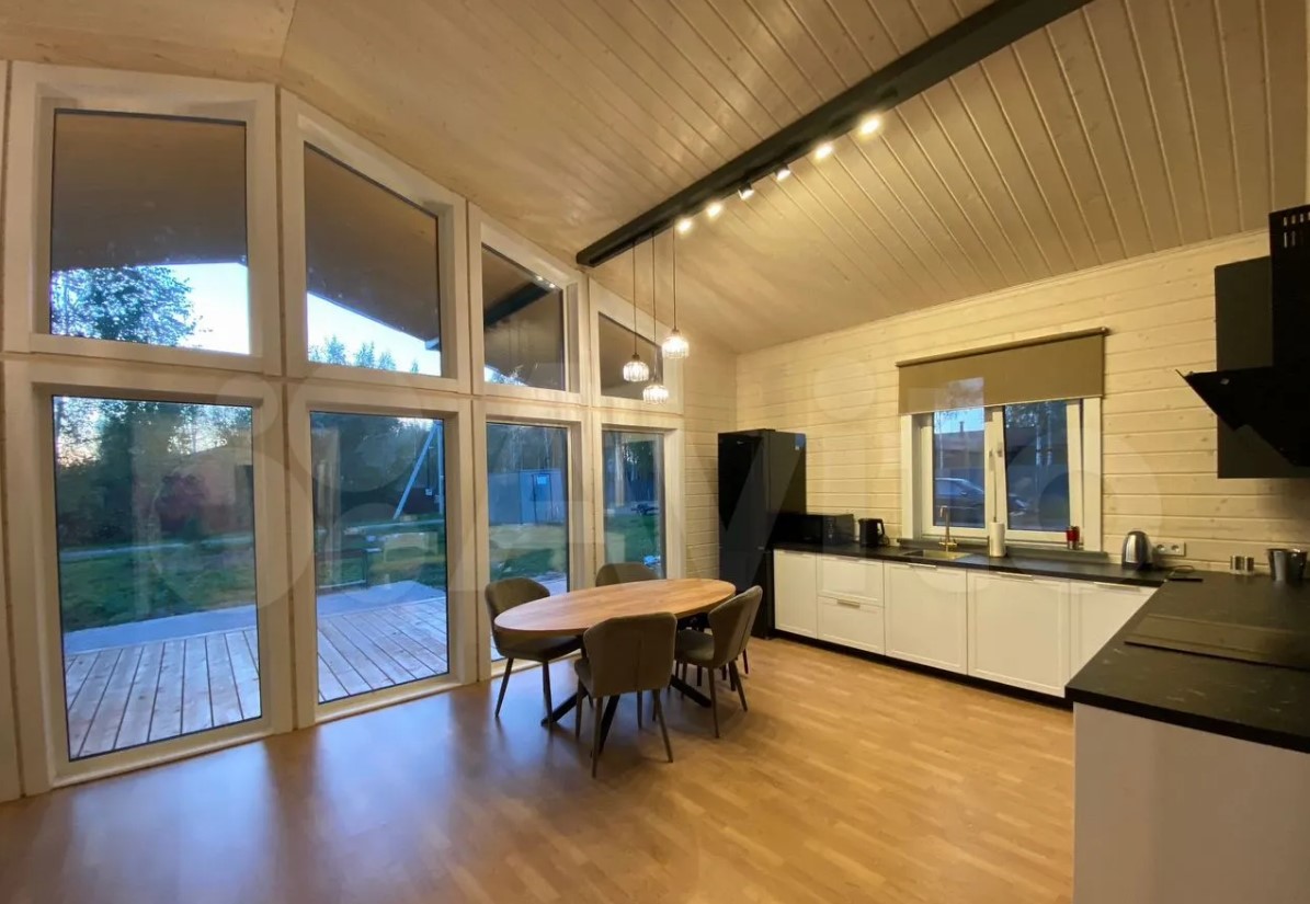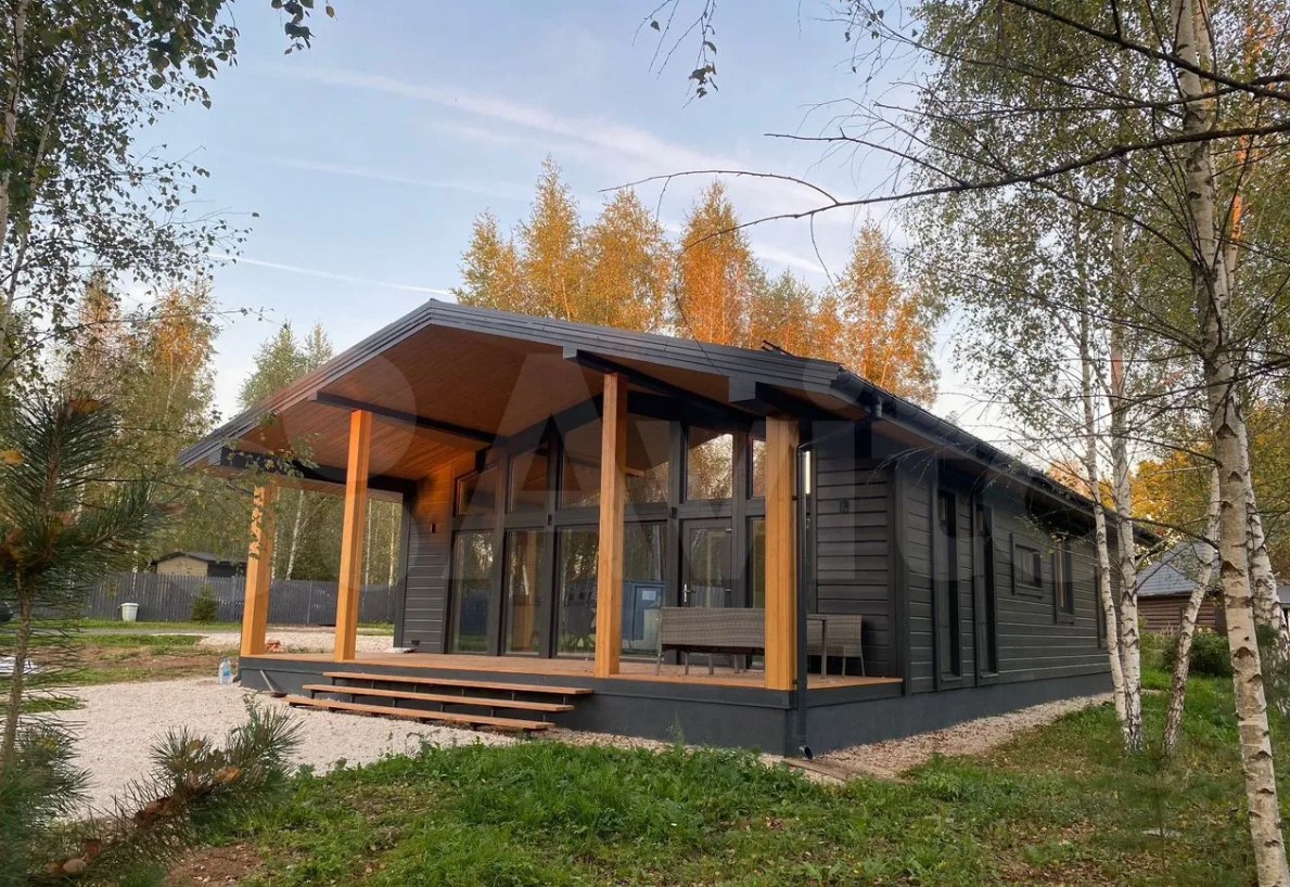 Дом полностью меблирован. Внутри — кухня-гостиная с панорамными окнами, три спальни, ванная комната и прихожая. Отдельно стоит баня, в которой также есть места для отдыха и приема пищи.