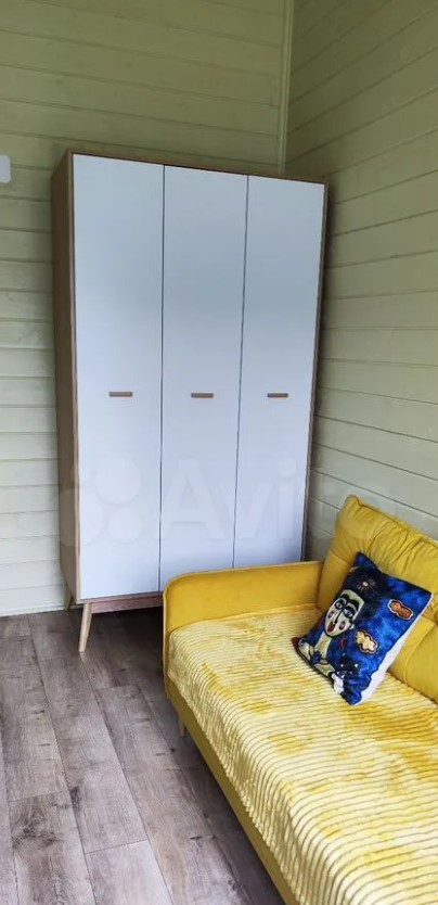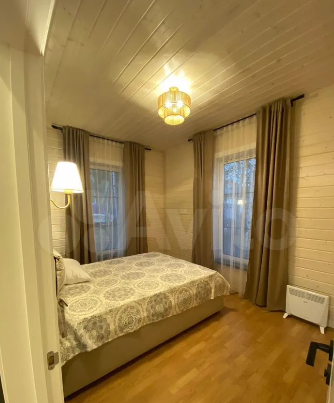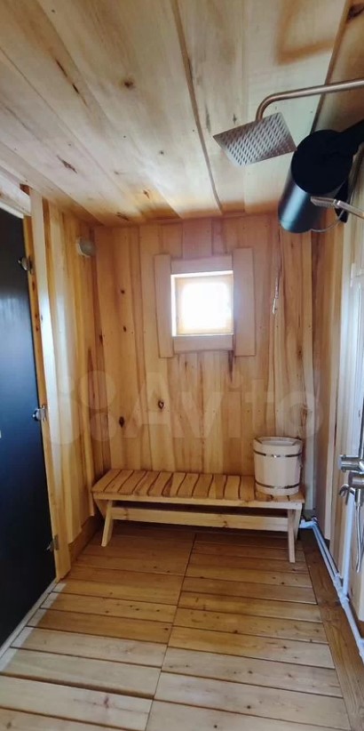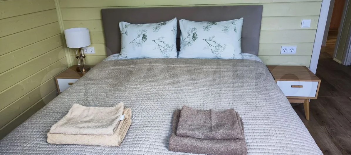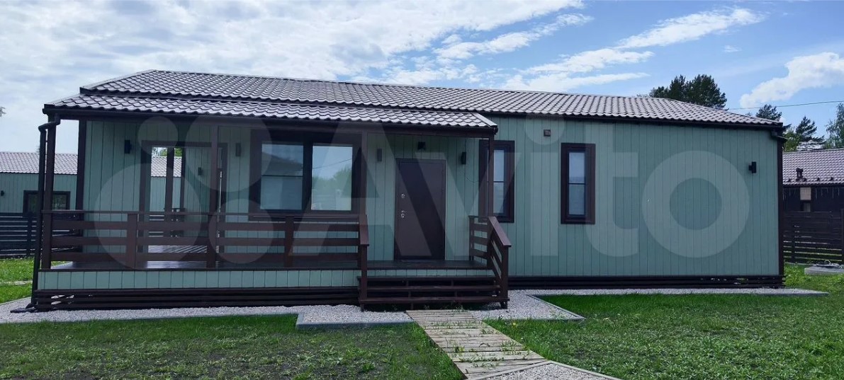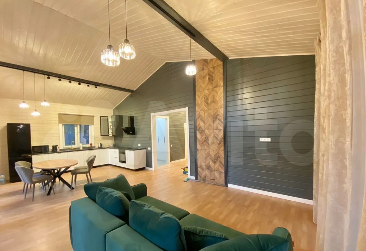 Дом полностью меблирован. Внутри — кухня-гостиная с панорамными окнами, три спальни, ванная комната и прихожая. Отдельно стоит баня, в которой также есть места для отдыха и приема пищи.