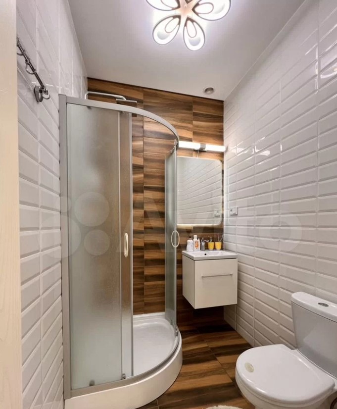 На первом этаже расположены прихожая с выходом в холл, кухня-гостиная с панорамными окнами, спальня и ванная комната. Выше — еще две спальни и вторая ванная комната. На первом этаже смонтирован теплый пол.