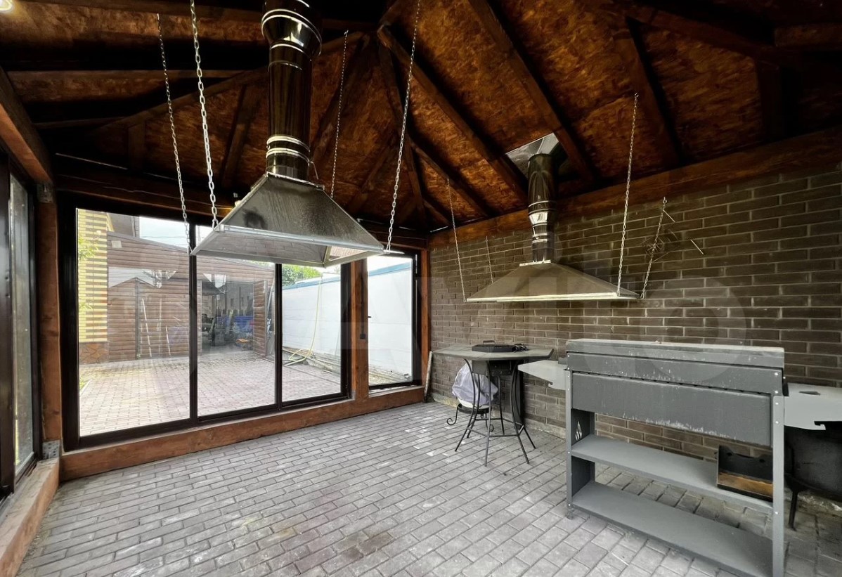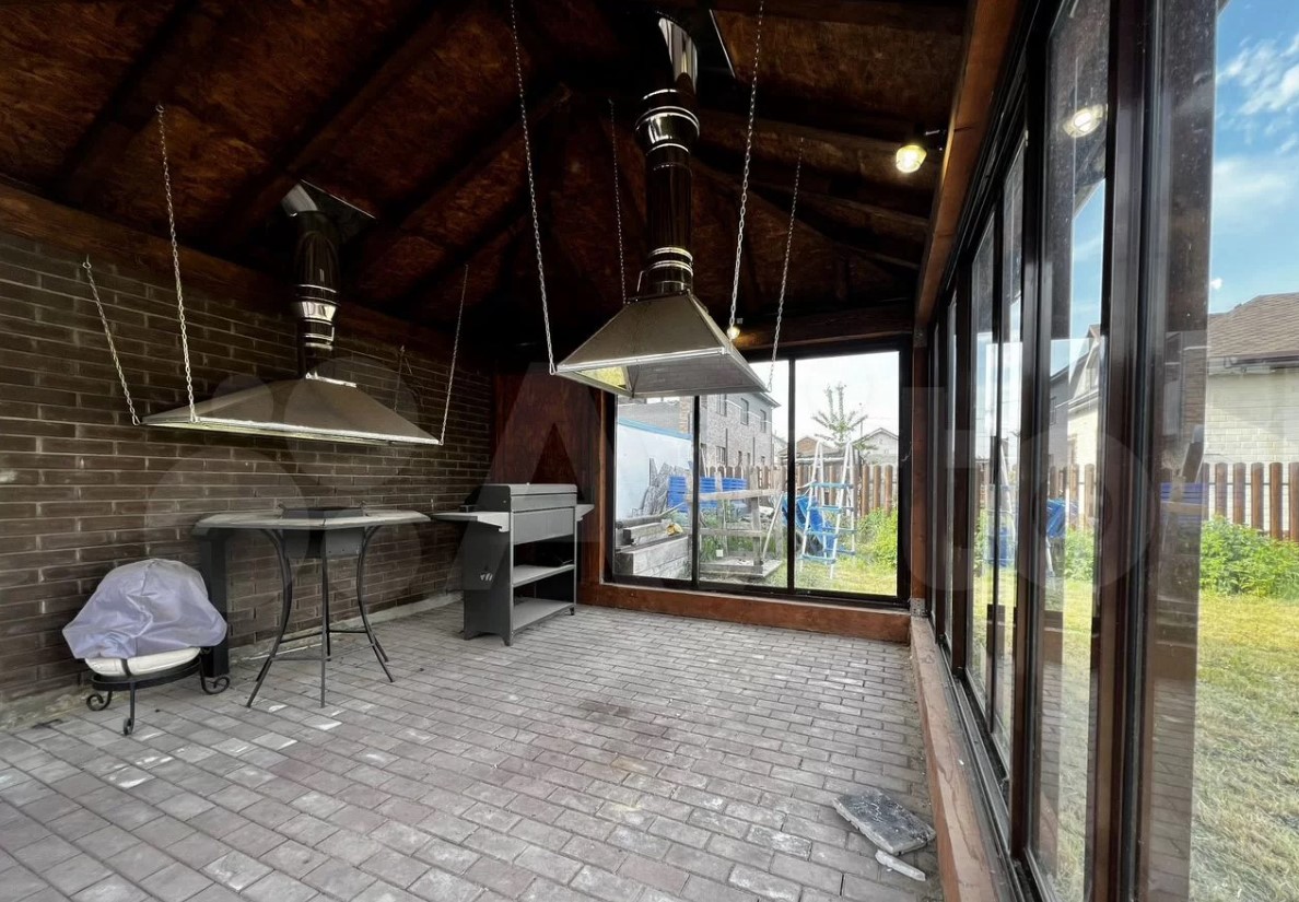 Система отопления в доме с климат-контролем, на первом этаже есть теплый пол, коммуникации проведены. На участке установлены беседка с мангальной зоной (окна тоже панорамные) и гараж.
