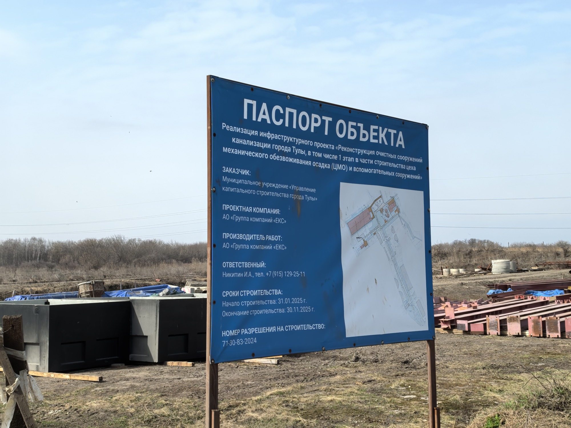 Комплекс стоимостью почти 1,5 миллиарда рублей включает сразу несколько сооружений. Как рассказал заместитель руководителя АО «Группа компаний «ЕКС»» Валентин Глухенький, уже сейчас площадка накопления обезвоженного осадка, резервуар очищенной воды, камера распределения и иловые отстойники готовы на 100%.