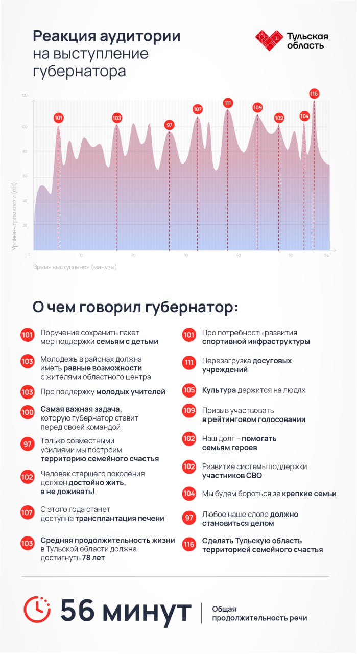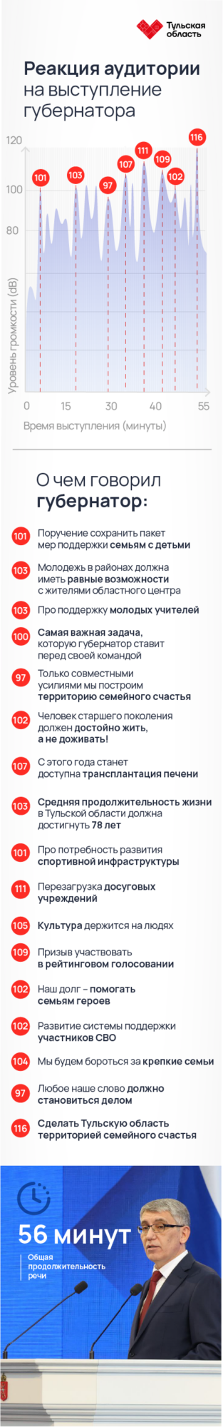 Послание Дмитрий Миляев зачитывал почти час, прерываясь аплодисментами. «Тульская пресса» решила проанализировать, какие заявления губернатора больше всего затронули туляков. Измеряли это мы децибелами. Итак, на какие слова зал отреагировал ярче всего, смотрите в нашей инфографике.