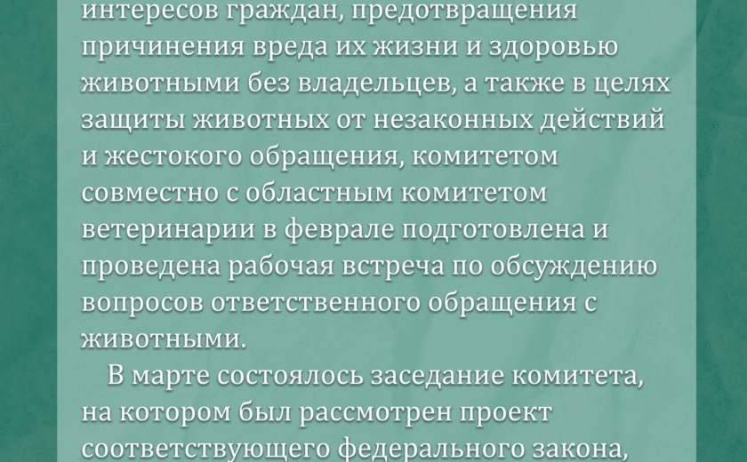 – Принимая во внимание необходимость обеспечения безопасности и законных интересов граждан, предотвращения причинения вреда их жизни и здоровью животными без владельцев, а также в целях защиты животных от незаконных действий и жестокого обращения, комитетом совместно с областным комитетом ветеринарии в феврале подготовлена и проведена рабочая встреча по обсуждению вопросов ответственного обращения с животными с участием депутатов областной Думы, представителей прокуратуры, совета муниципальных образований, правительства региона.