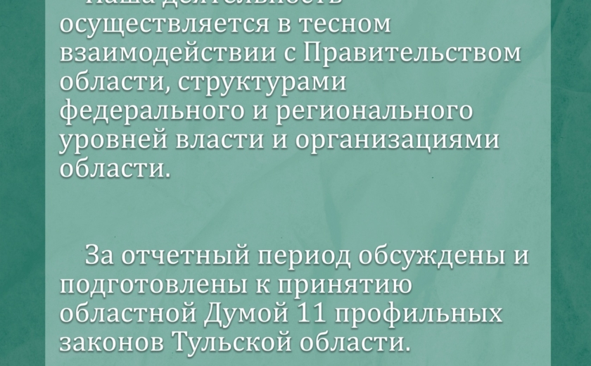 За отчетный период проведено 20 заседаний комитета, на которых рассмотрено 129 вопросов, в том числе обсуждены и подготовлены к принятию областной Думой 11 профильных законов Тульской области.
