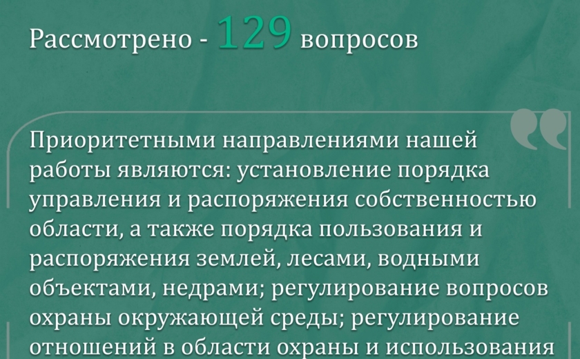 – Приоритетными направлениями нашей работы являются: установление порядка управления и распоряжения собственностью области, а также порядка пользования и распоряжения землей, лесами, водными объектами, недрами; регулирование вопросов охраны окружающей среды; регулирование отношений в области охраны и использования животного мира, обращения с животными, охоты и сохранения охотничьих ресурсов.