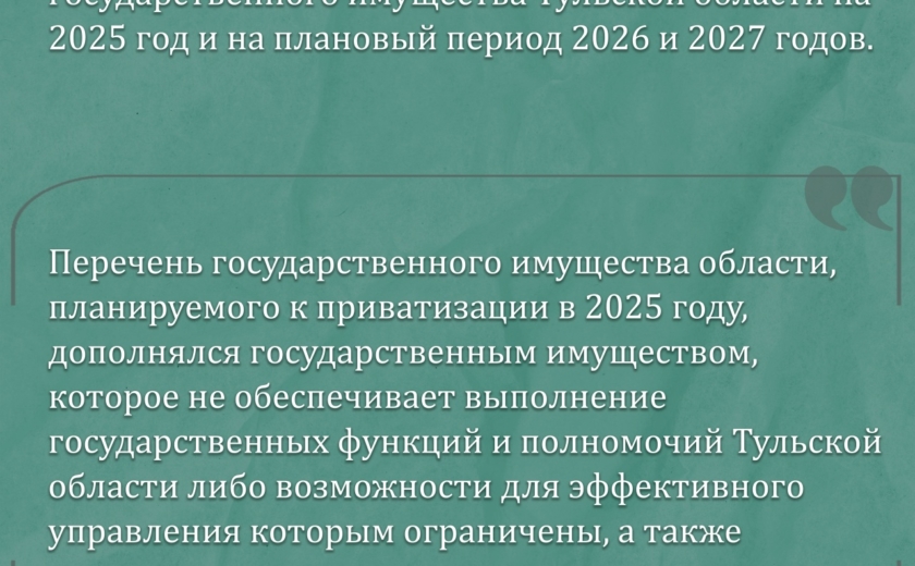 – Перечень государственного имущества области, планируемого к приватизации в 2025 году, дополнялся государственным имуществом, которое не обеспечивает выполнение государственных функций и полномочий Тульской области либо возможности для эффективного управления которым ограничены, а также корректировался с учетом несостоявшихся торгов по продаже имущественных комплексов в 2024 году.