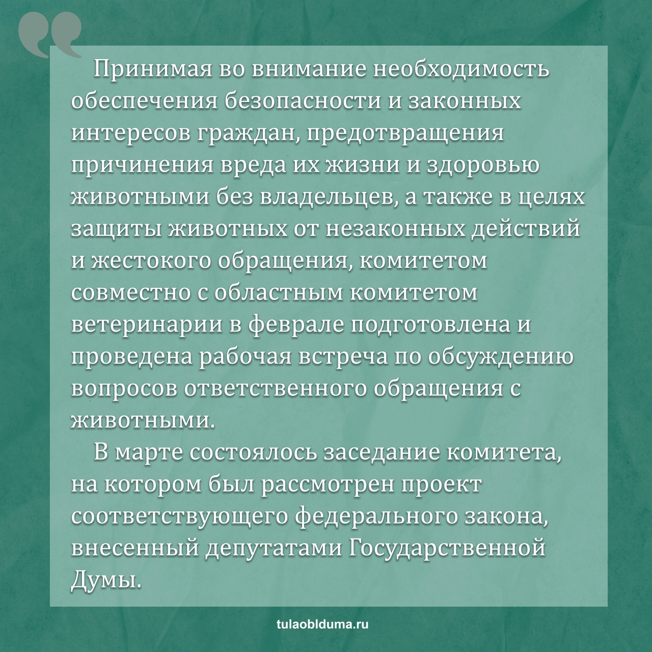 – Принимая во внимание необходимость обеспечения безопасности и законных интересов граждан, предотвращения причинения вреда их жизни и здоровью животными без владельцев, а также в целях защиты животных от незаконных действий и жестокого обращения, комитетом совместно с областным комитетом ветеринарии в феврале подготовлена и проведена рабочая встреча по обсуждению вопросов ответственного обращения с животными с участием депутатов областной Думы, представителей прокуратуры, совета муниципальных образований, правительства региона.