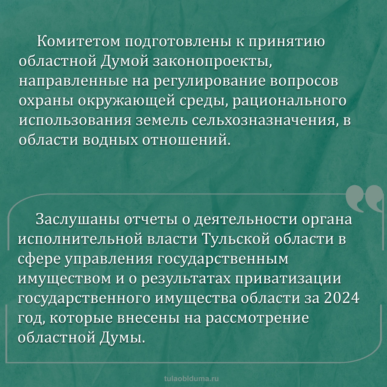 Заслушаны отчеты о деятельности органа исполнительной власти Тульской области в сфере управления государственным имуществом и о результатах приватизации государственного имущества области за 2024 год, которые внесены на рассмотрение областной Думы.