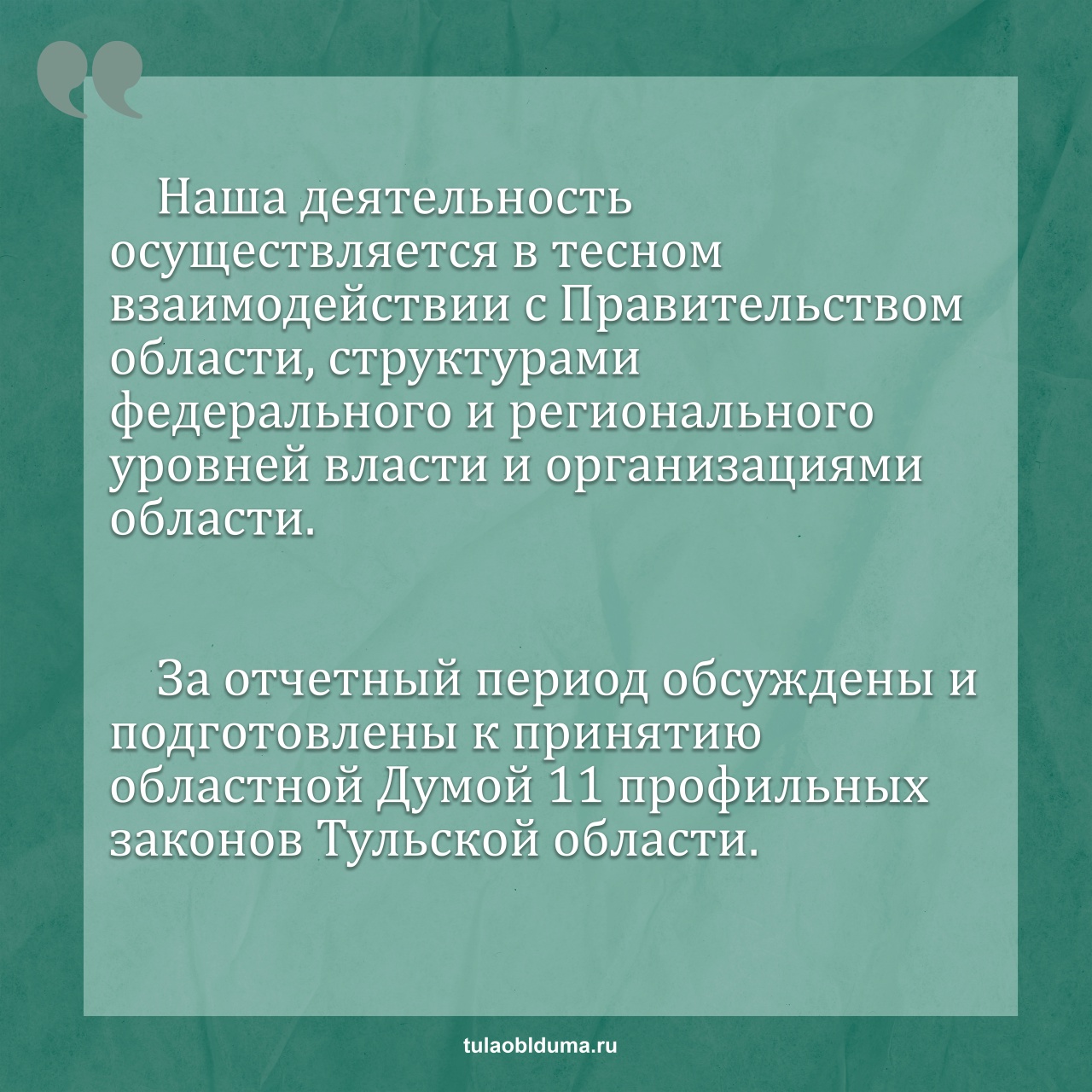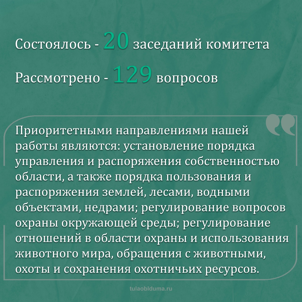 За отчетный период проведено 20 заседаний комитета, на которых рассмотрено 129 вопросов, в том числе обсуждены и подготовлены к принятию областной Думой 11 профильных законов Тульской области.